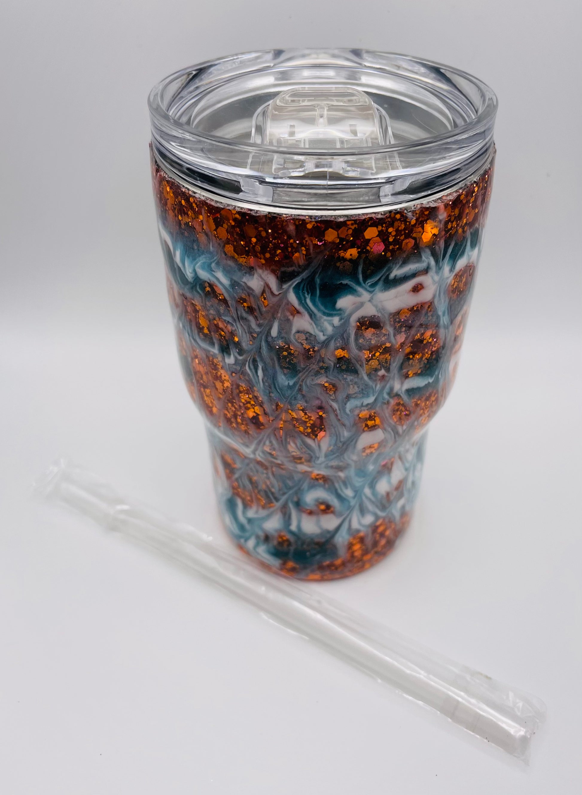This 14-ounce tumbler with lid is perfect for hot and cold beverages with its double wall insulation and acrylic material. The tumbler features a beautiful blue ink swirl and coppery glitter - perfect for gifting or personalization. Get one today!