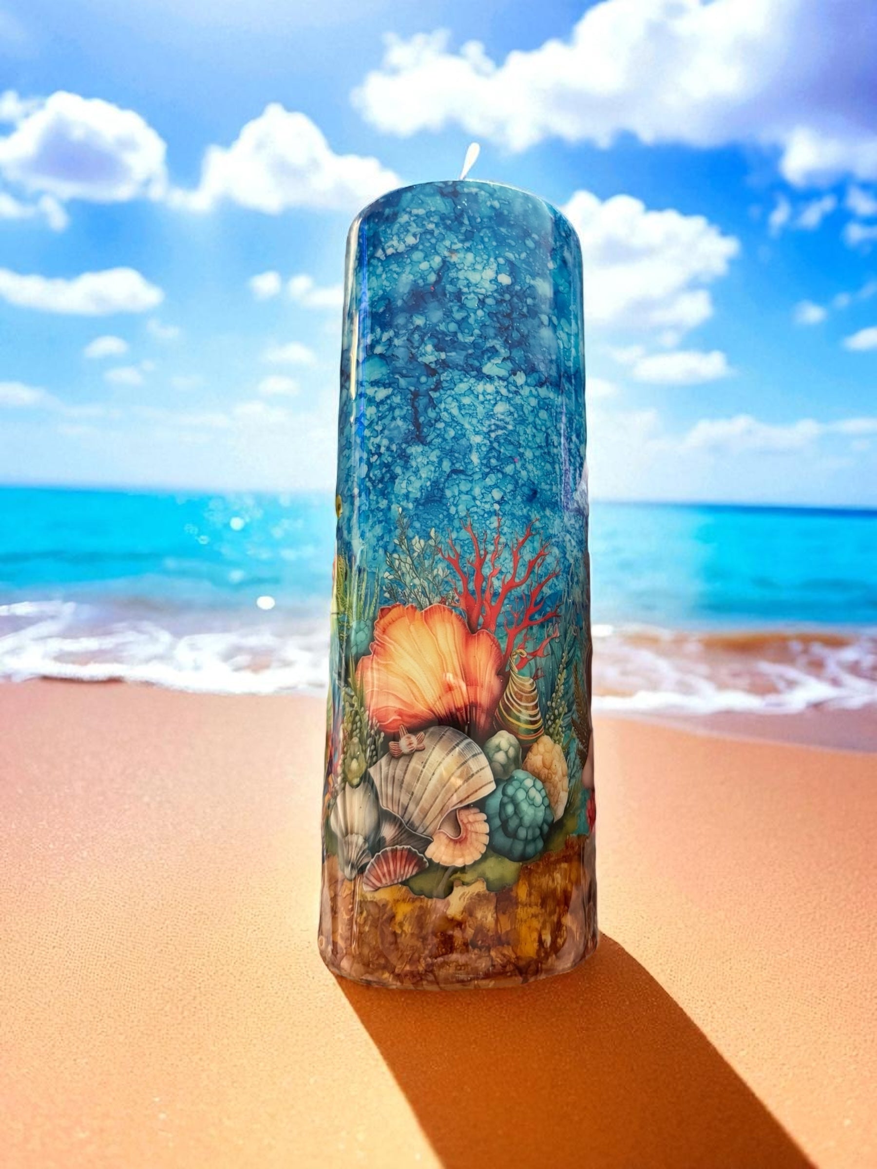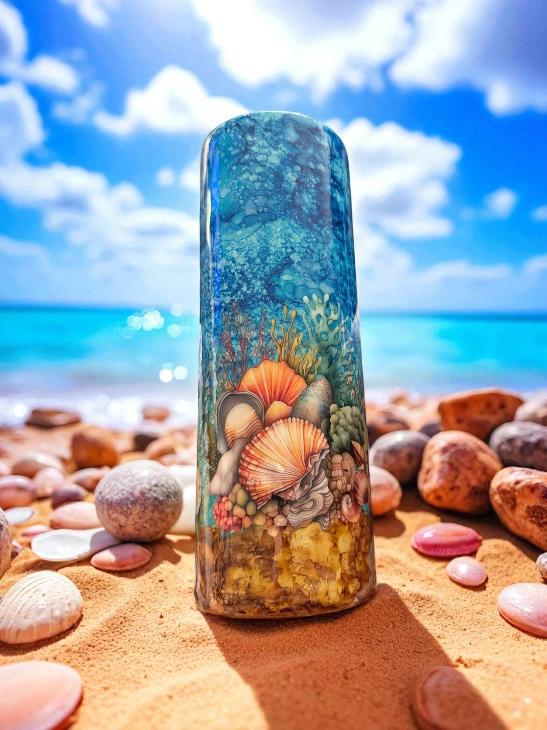 Boost your hydration game with our 20 ounce stainless steel Tumblr featuring a stylish ink background design and beach themed turtles, seashells, and sand. Made to keep your drinks cold for hours, this Tumblr is perfect for any beach day or outdoor adventure. Order now and stay refreshed in style!