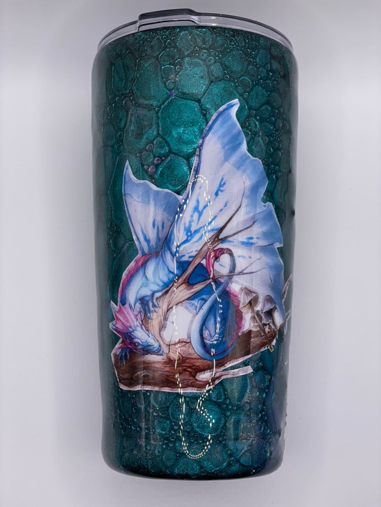 The 20 Ounce Modern Fairy Dragon tumbler is a sophisticated and stylish choice for your beverage needs. Dragon scale base with chameleon changing mica. Crafted from double walled stainless steel, this tumbler is insulated to retain temperatures while remaining comfortable to the touch. Personalization options are available for a personalized touch, and the design can be reproduced in different colors and decals. Ready to ship, it's a great gift!