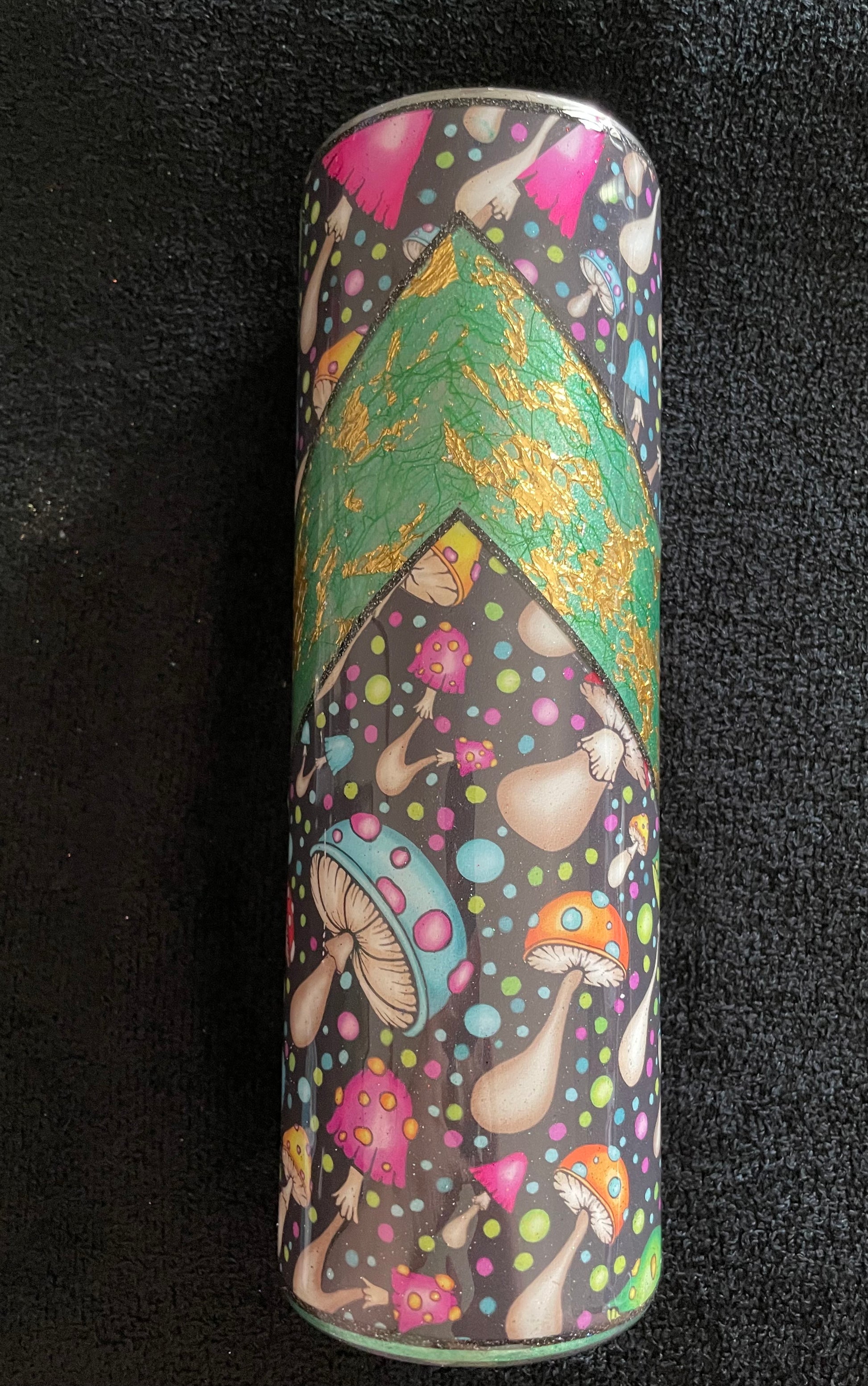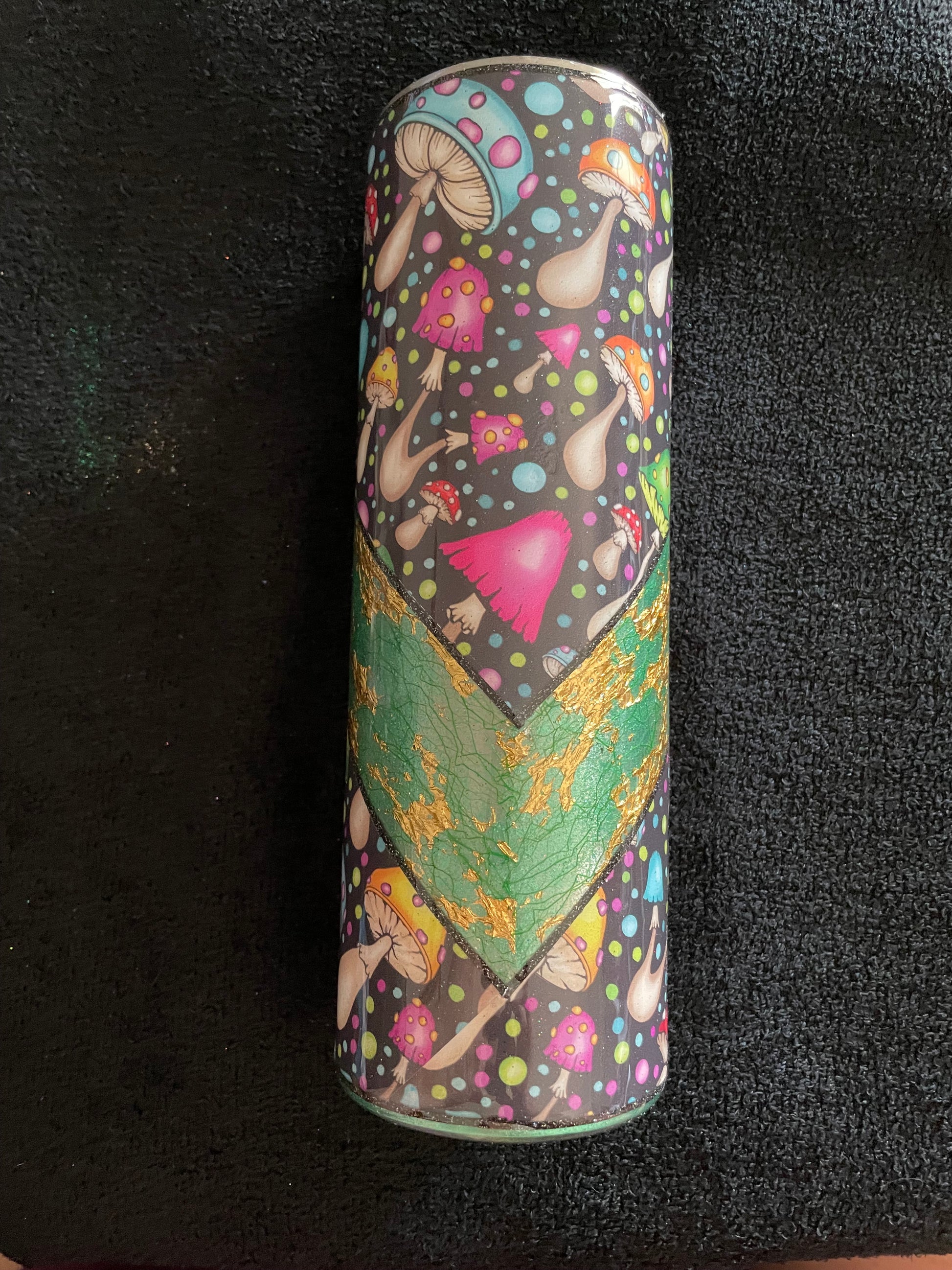 This 30 ounce Lacey V mushroom Tumblr is a great gift item, featuring a stunning and colorful mushroom design by Lacey V. Handmade with stainless steel and a double-walled design, this tumbler is both functional and stylish. Order now and personalize it with gold foil and green lace. A perfect accessory for any beverage lover!