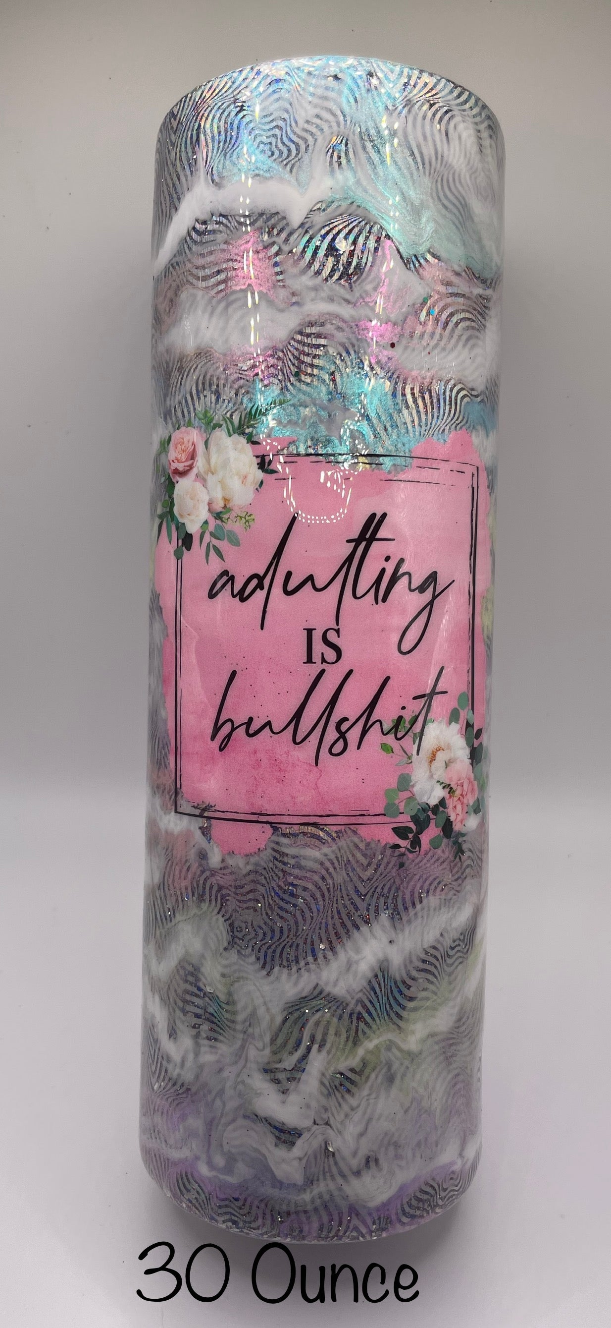 Cool off with this 30-ounce tumbler that beats the heat with a metallic foil-base and colorful pastel inks. Stainless steel and ready to ship. "Adulting is bullshit" quote. Add a personalized touch with your choice with your name!