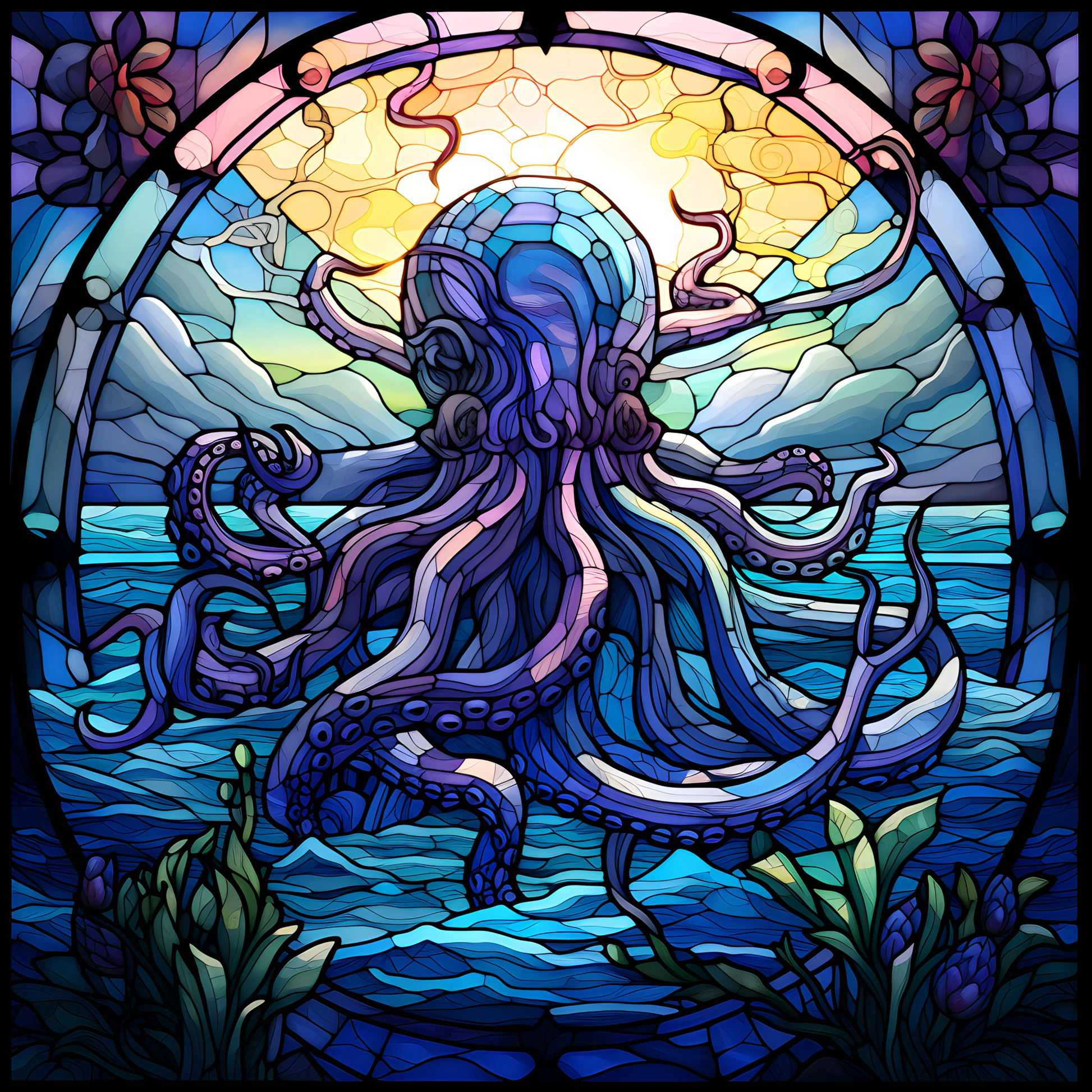 "Embrace the unknown with our 30 Ounce Octopus stainless steel tumbler! With a stunning stained glass design in bold blues and purples, accented with glittered vinyl, this handmade tumbler is perfect for those who crave adventure. Order now and make a splash with every sip!"