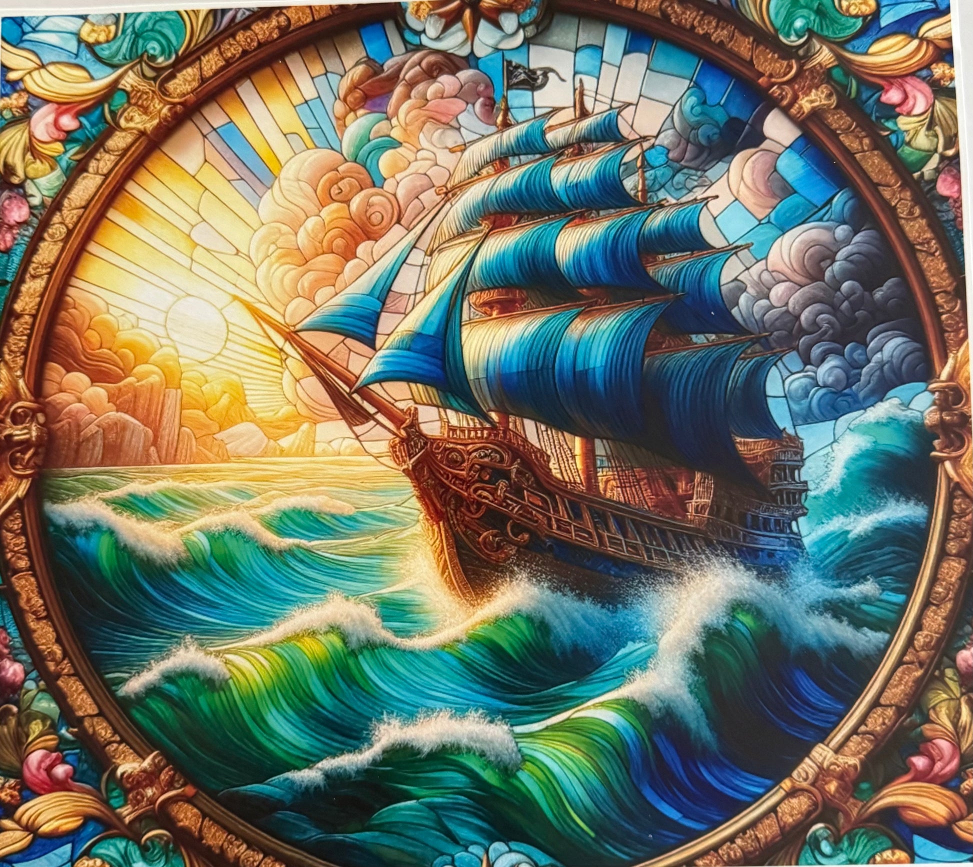 "Sail away with this 30 Ounce SH Set Sail Accents Tumblr! The vibrant stain glass design, hand glittered vinyl accents, and fun pirate ship and sea wave details make it a great gift for any adventure-loving friend. Order now to add a splash of color to your stainless steel Tumblr collection."