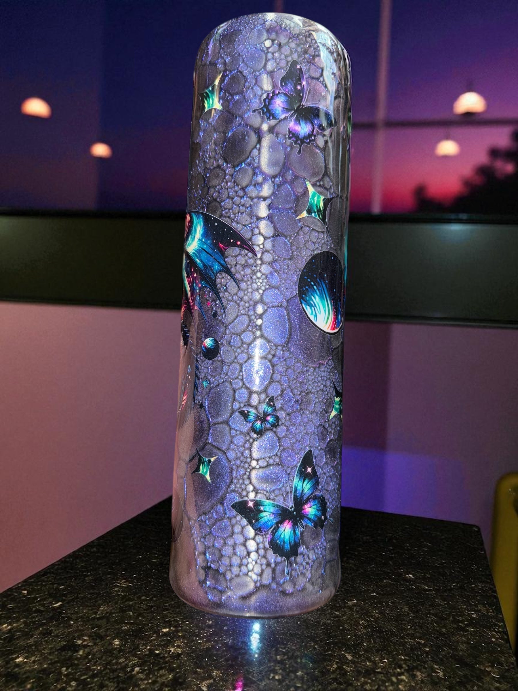 Experience out-of-this-world hydration with our 35 Ounce Dragon Themed Tumblr. Handmade with a unique dragon scale technique background and colorful dragon design, this Tumblr holds 35 ounces and is perfect for those who enjoy bold and colorful accessories. Plus, its double stainless steel construction keeps your drinks at the perfect temperature. Get one now for yourself or as a great gift for a friend!