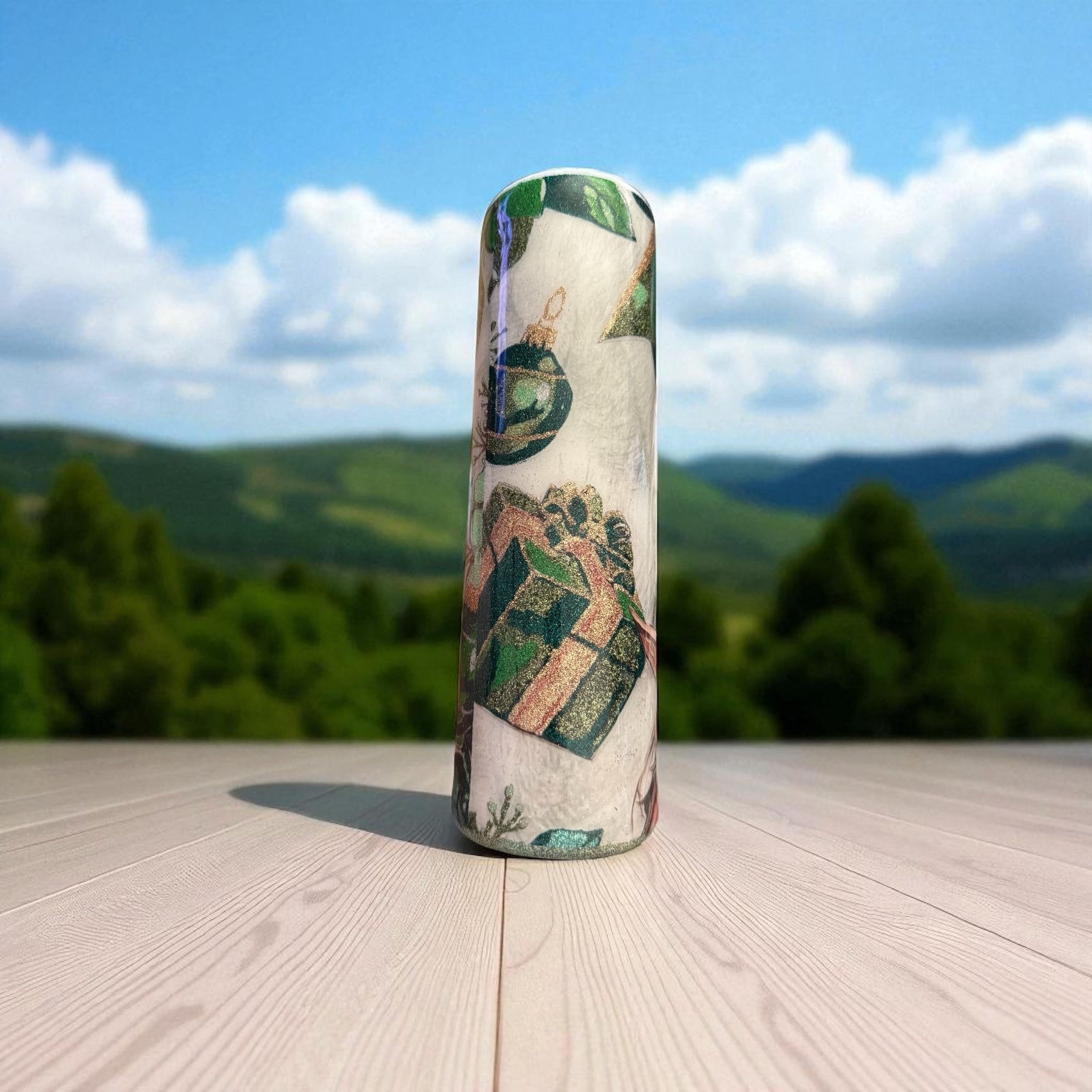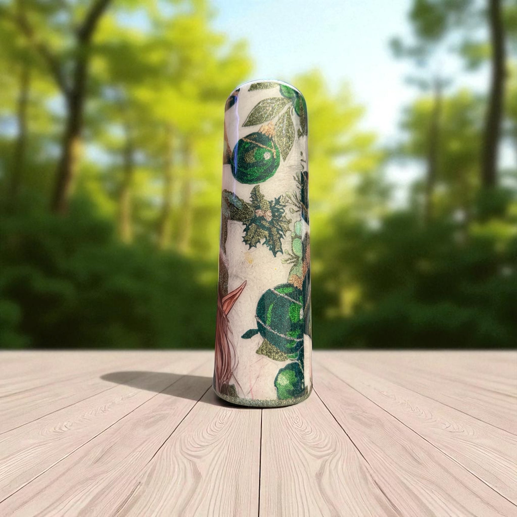 Spread some holiday cheer with this 35-ounce Green Christmas Elf Tumblr! Its stainless steel construction keeps your drink hot or cold while its festive design of elves, holly, and glitter adds a fun touch. Perfect for gifting or keeping for yourself, order now before it's gone! (Bose and bubbles not included)
