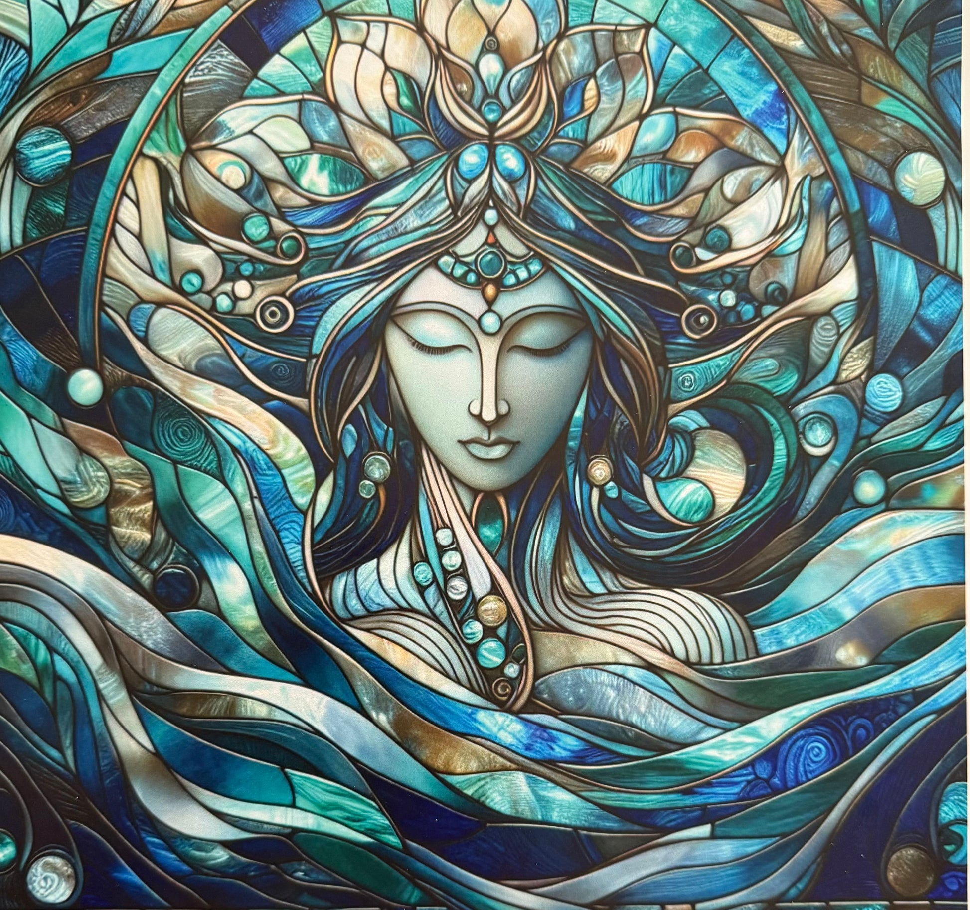 Add a touch of divine elegance to your drinkware with our Stained Glass, mother of pearl goddess Tumblr. Hand glittered vinyl creates a stunning visual, while stainless steel provides durability. Customize with pearls or rhinestones for a truly one-of-a-kind gift. Order now for a unique addition to your collection.