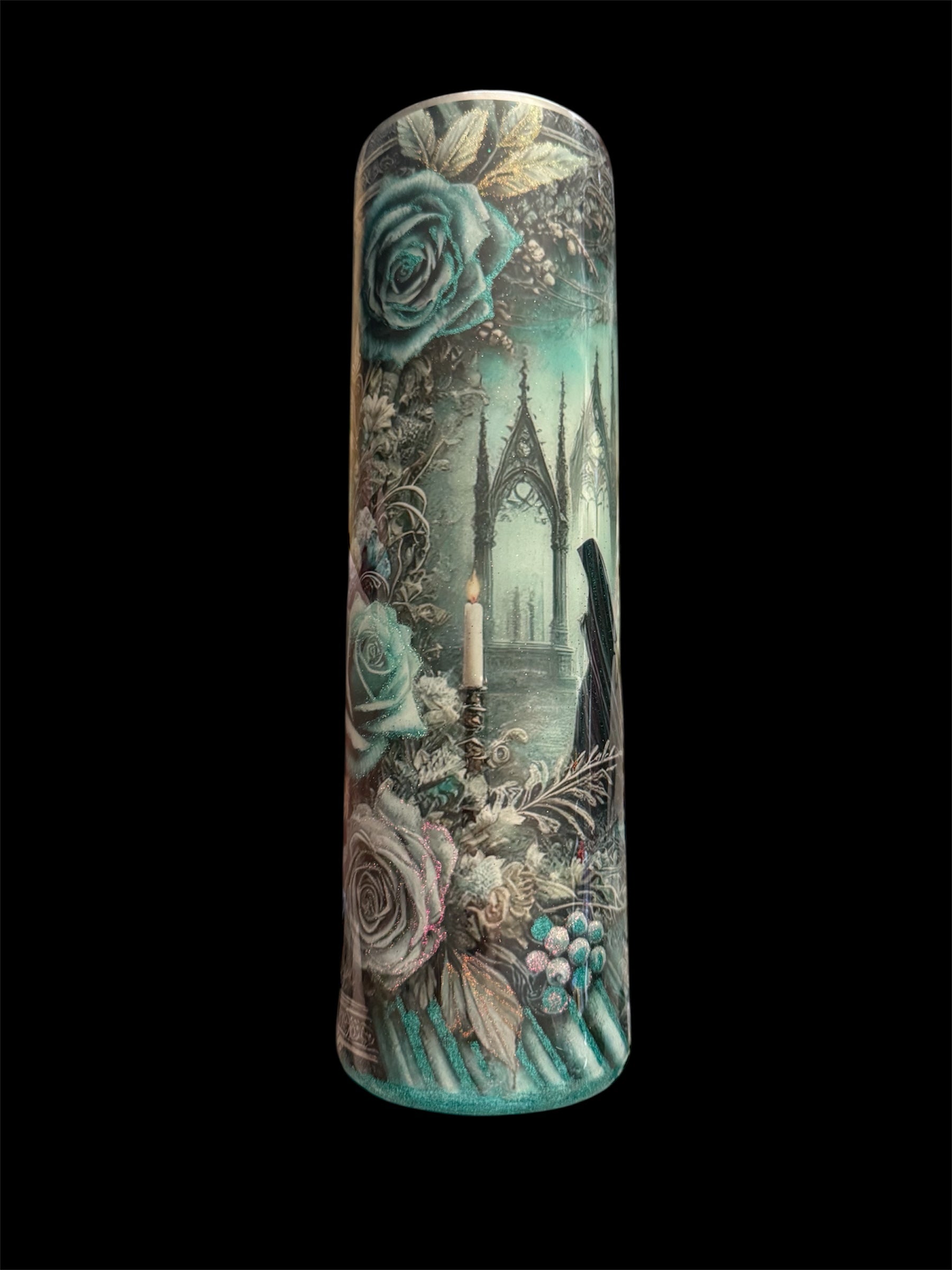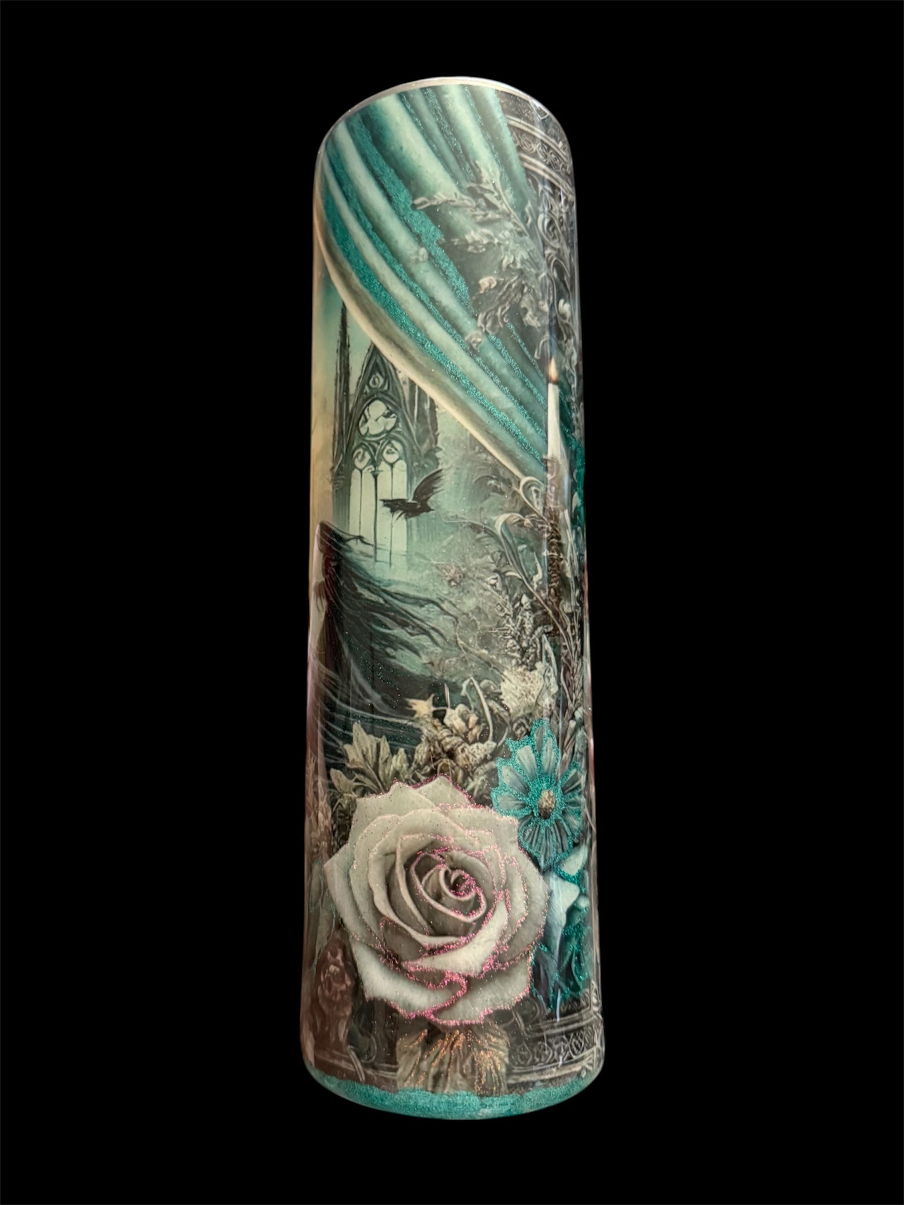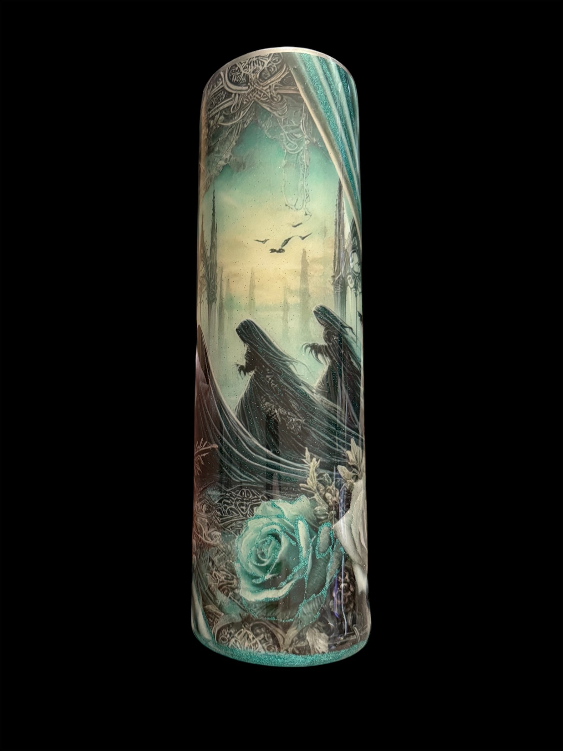 "Get your daily dose of hydration in style with our 35 Ounce Three Shadows Tumblr. Made of high-quality stainless steel, it features a beautiful turquoise and blue floral design that will make your drinks pop. A hint of fright adds a unique touch. A great gift for anyone! Order now!" Accents of glitter added