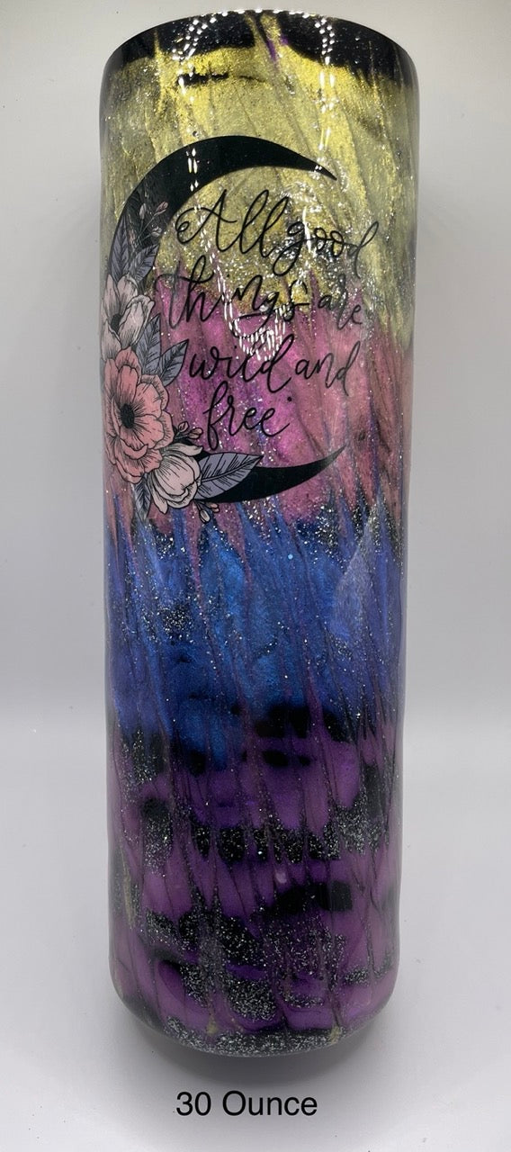 This 30-ounce decal tumbler features a vibrant blend of red, blue, gold, and purple pigments for a unique look. Personalization options available, perfect for gifting or ready to ship! Enjoy a long-lasting and stylish tumbler with a one-of-a-kind design. Quote says, "All good things are wild and free"