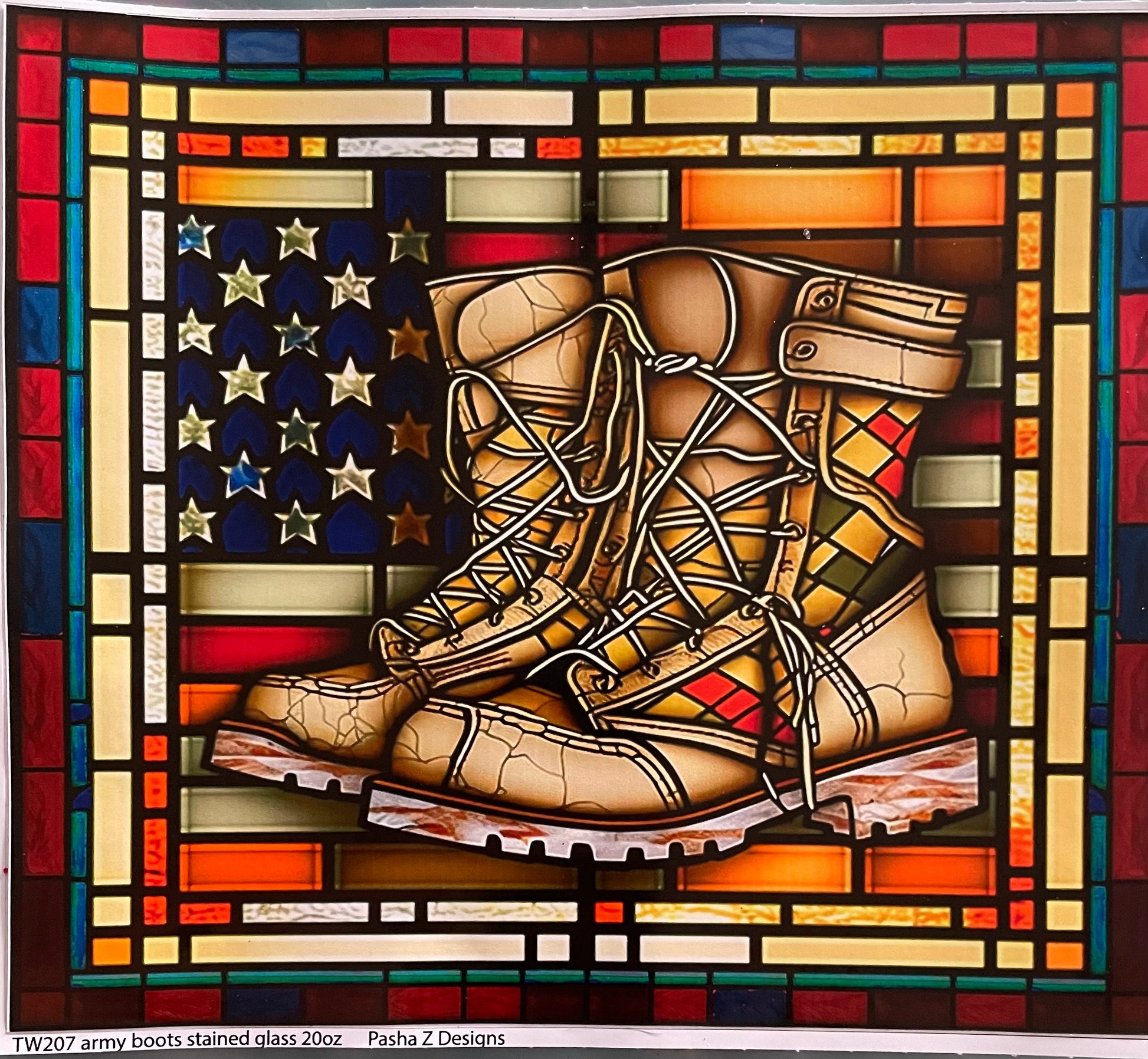 The perfect gift for the proud patriot! These Army boots feature a unique stained glass design made with glittered vinyl. Made of stainless steel, this tumbler is durable and ready for all your adventures. Order now and express your love for country and style with every sip.