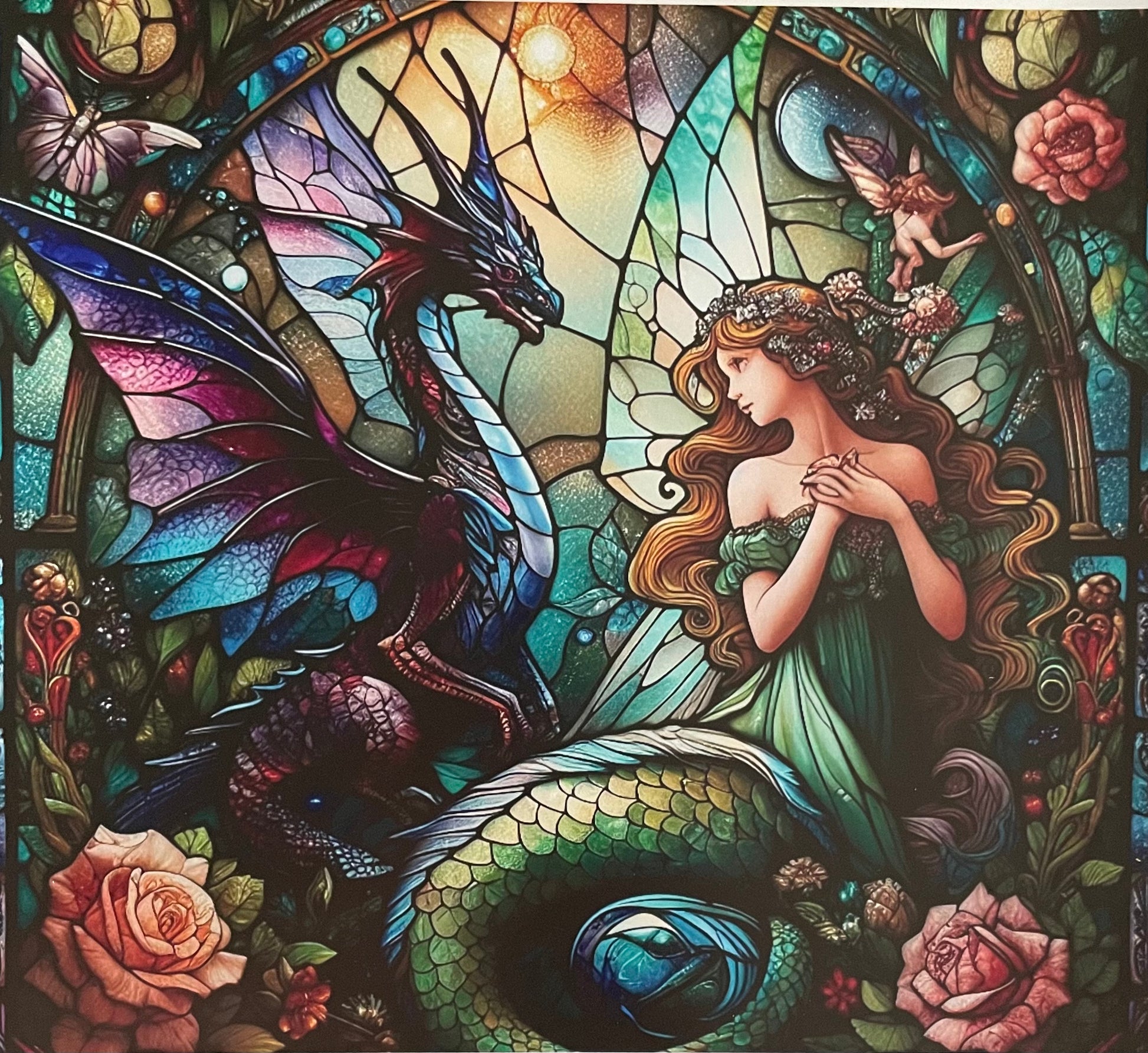 Unleash the adventurer in you with our Dragon Saviour Stained Glass Tumblr! This 30 ounce, stainless steel Tumblr is hand glittered to perfection, featuring a colorful and vibrant dragon and fairy maiden design. Perfect as a gift or for your own daring adventures. Order now and conquer the day!