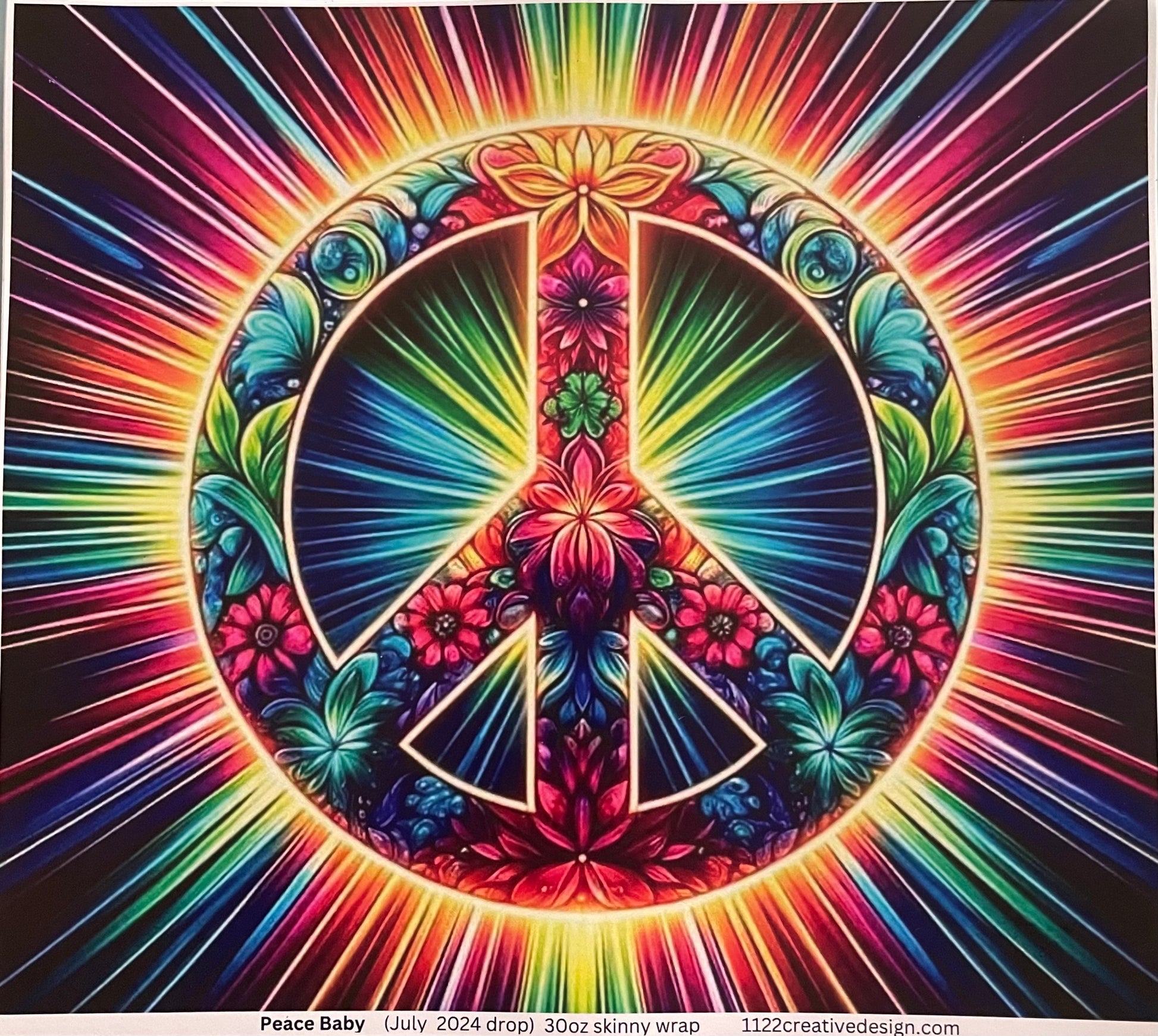 Get ready to spread some peace and color with our Peace Baby 30 ounce tumbler. This stainless steel tumbler features a hand-glittered, rainbow and colorful vinyl design, making it a unique and eye-catching addition to your collection. Keeps drinks perfectly hot or cold and makes a great handmade gift. Order now for a truly one-of-a-kind experience!