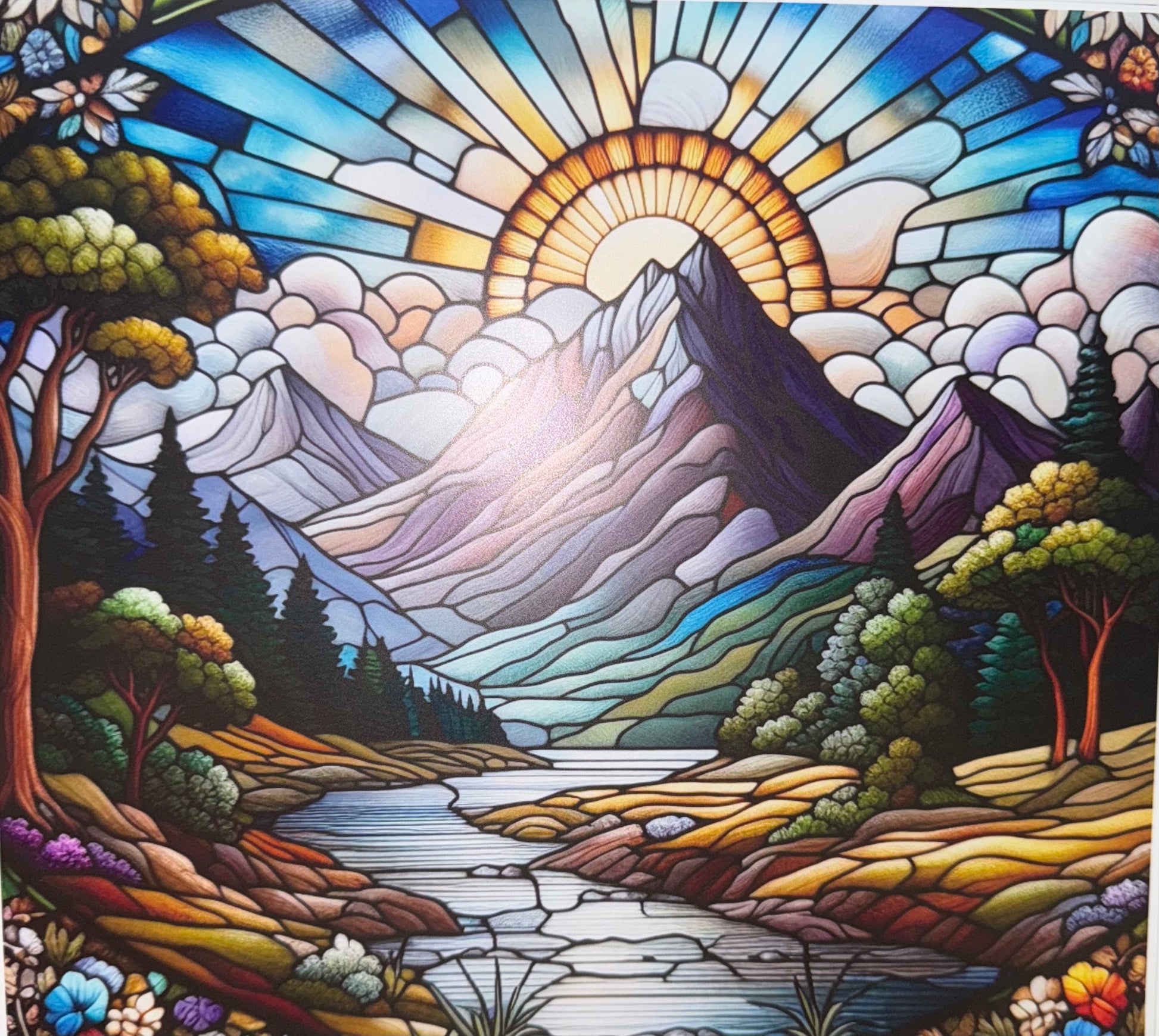 Experience the beauty of nature with our SG River Run 30 Ounce tumbler! This stunning stained glass design captures the essence of a peaceful river surrounded by majestic mountains and colorful flowers. Perfect as a gift for any nature lover. Order now and bring the tranquility of nature to your daily routine!