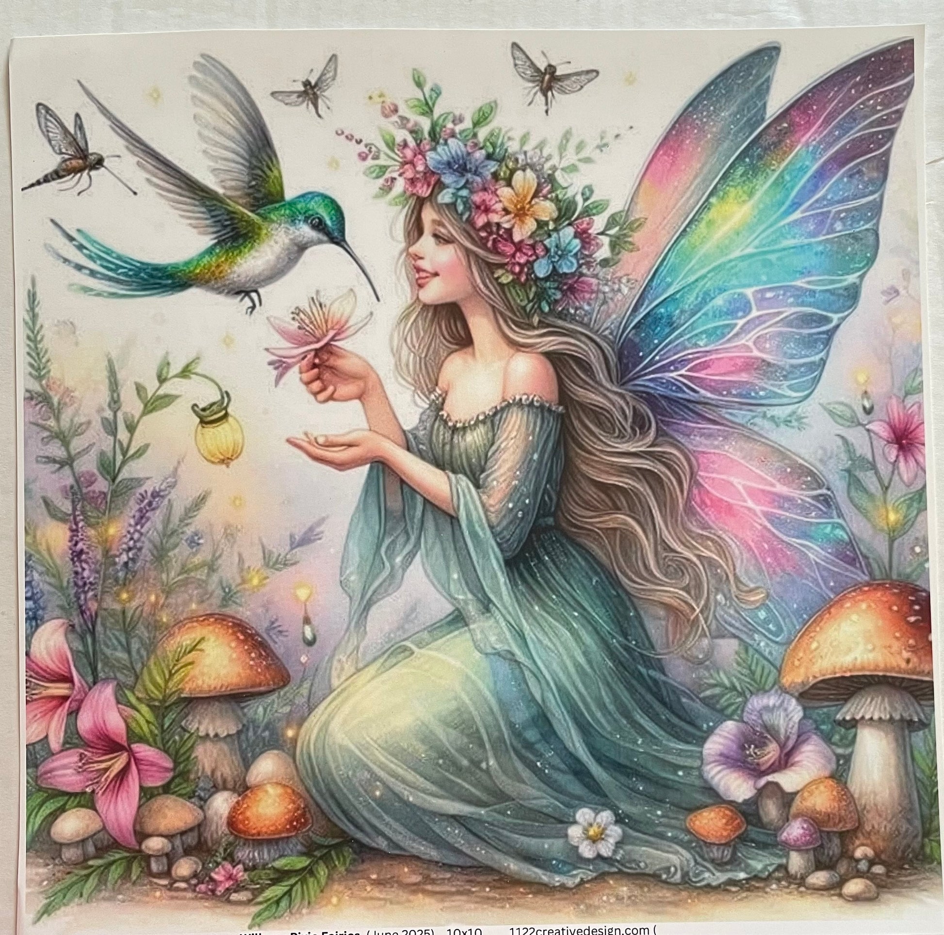 "Add a touch of whimsy to your cup collection with our handmade glimmering design featuring fairies, hummingbirds, and flowers. A unique gift for any fantasy lover. Order now and get ready to sparkle!"